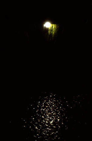 Lamps shine mysteriously through trees in the nighttime, creating patches of sparkling light on the river.
