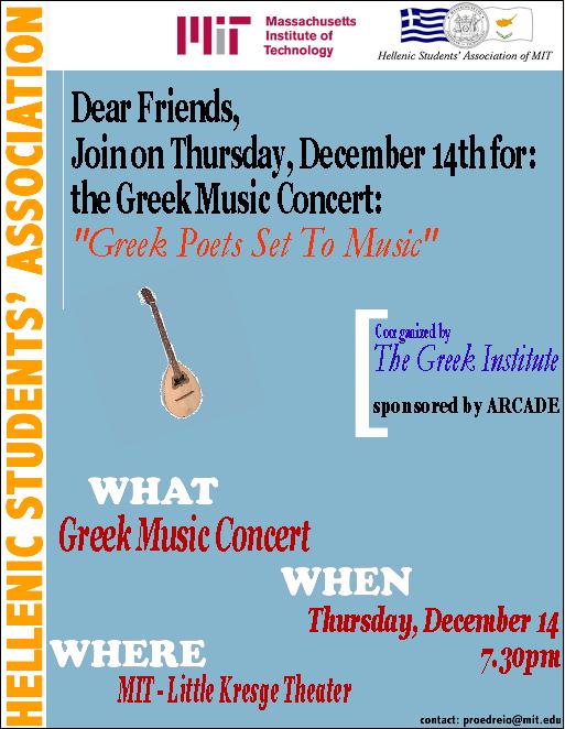 We would like to invite you to the concert of the Greek Music Ensemble on Sunday, November 23, 2008, 7:30 p.m at Kresge Little Theater on MIT Campus, in Boston, MA. The Greek Music Ensembe will perform Classi Rebetika songs.