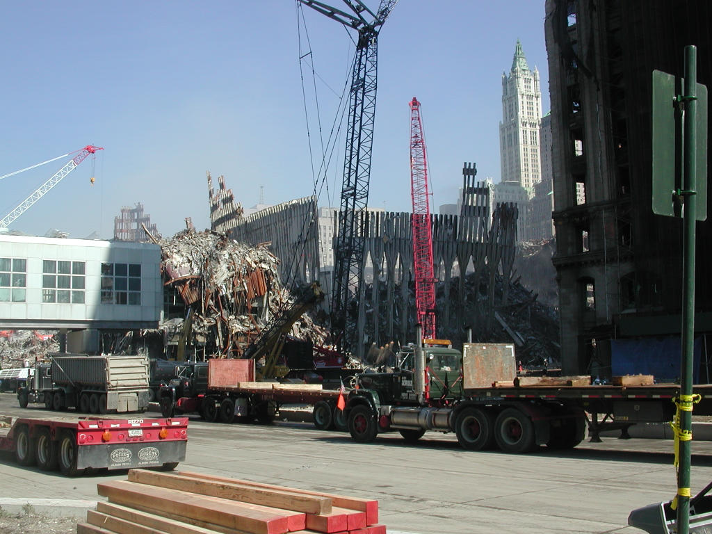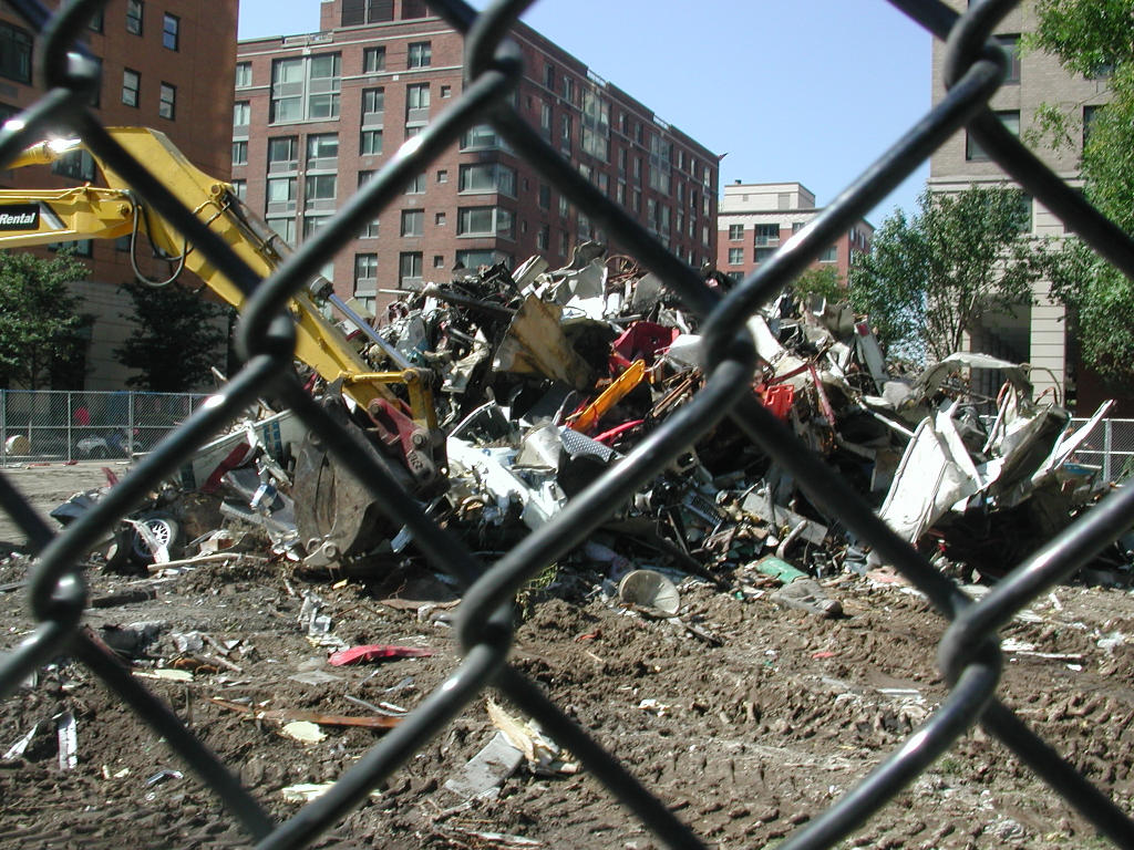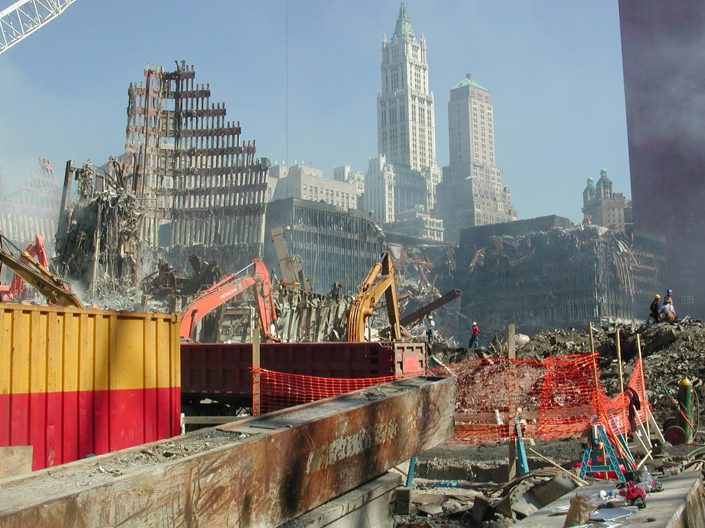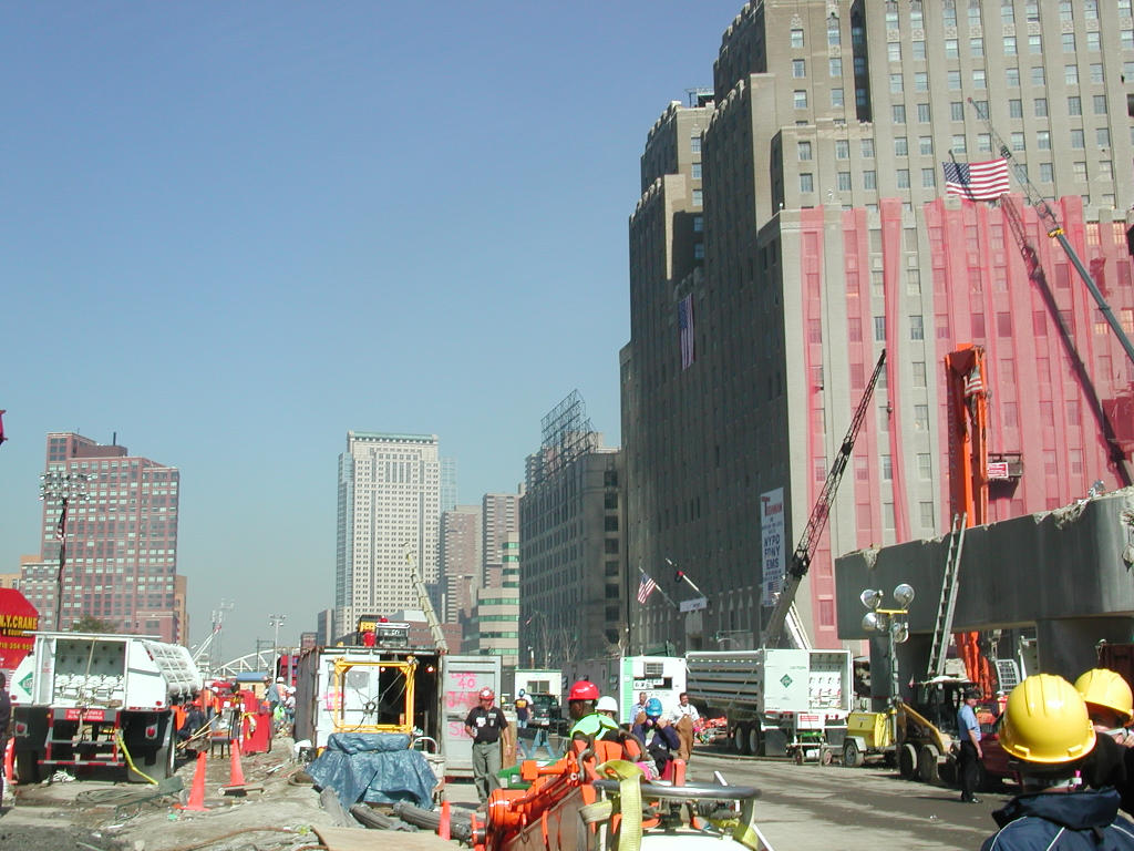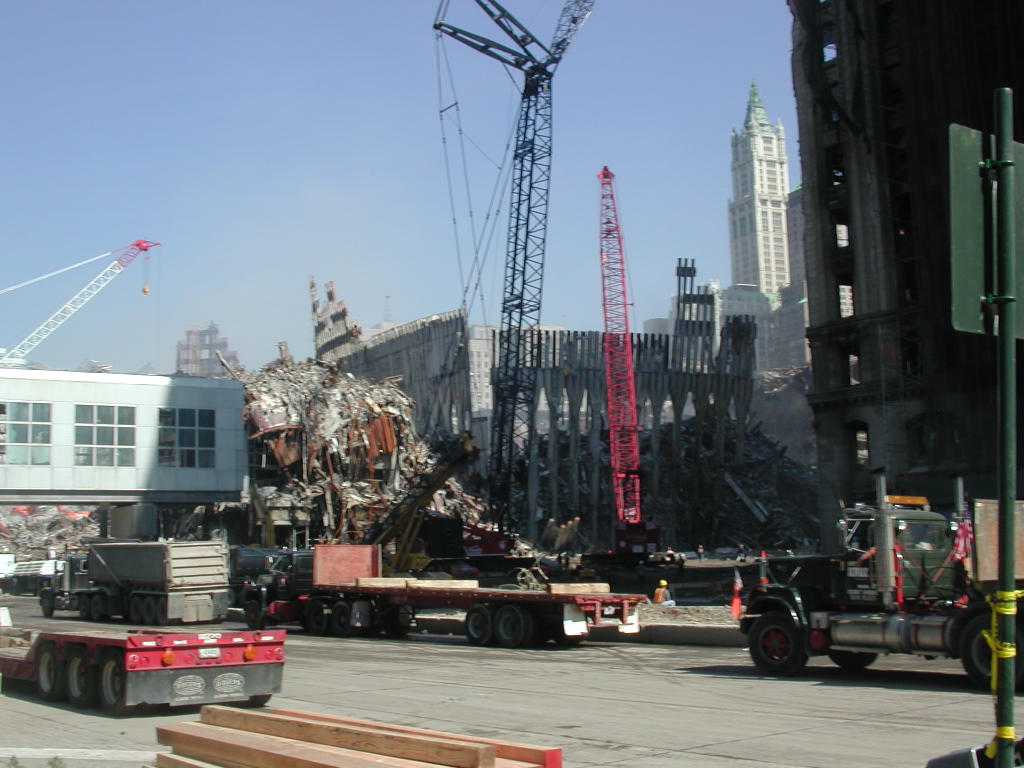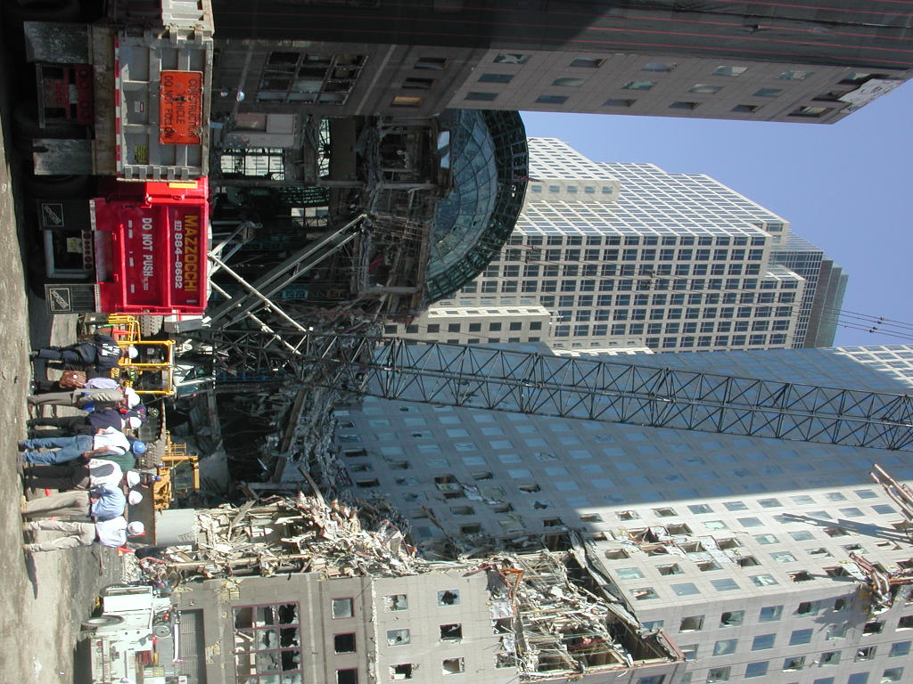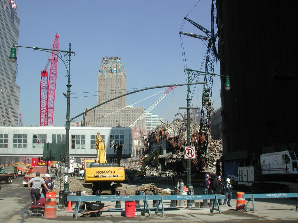 These 72 photographs of the World Trade Center disaster site in New York City were taken by AP on 3 October 2001, about noon. The first few, 001-004, were taken from Broadway, walking south, several blocks east of the WTC site from street corners where a part of the site can be seen. These locations are where the public is blocked by barricades and guards.