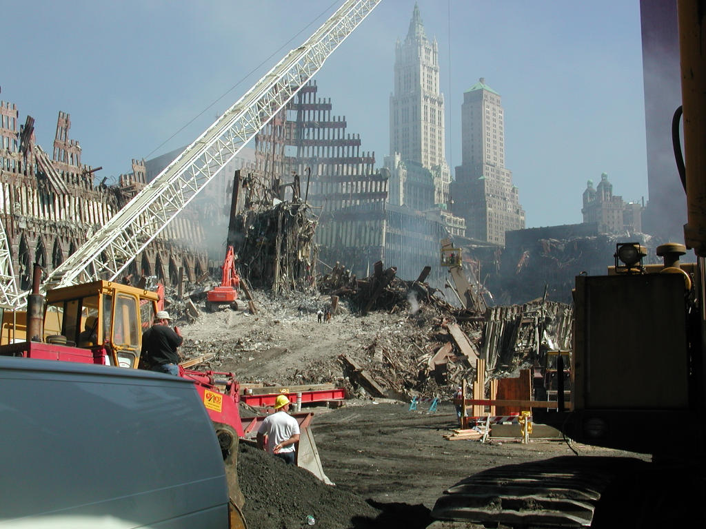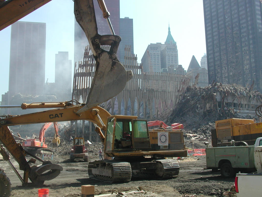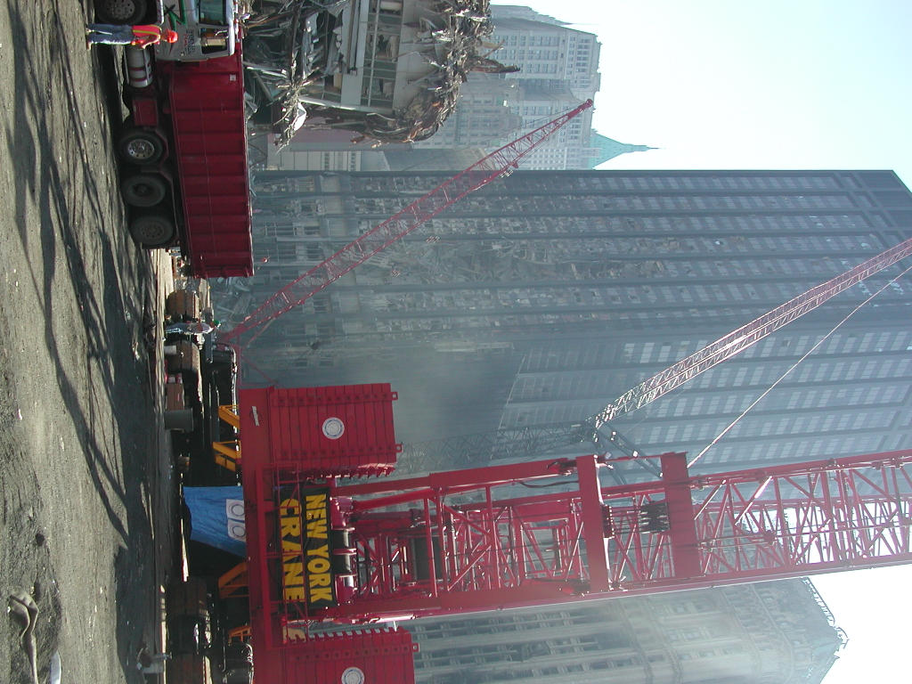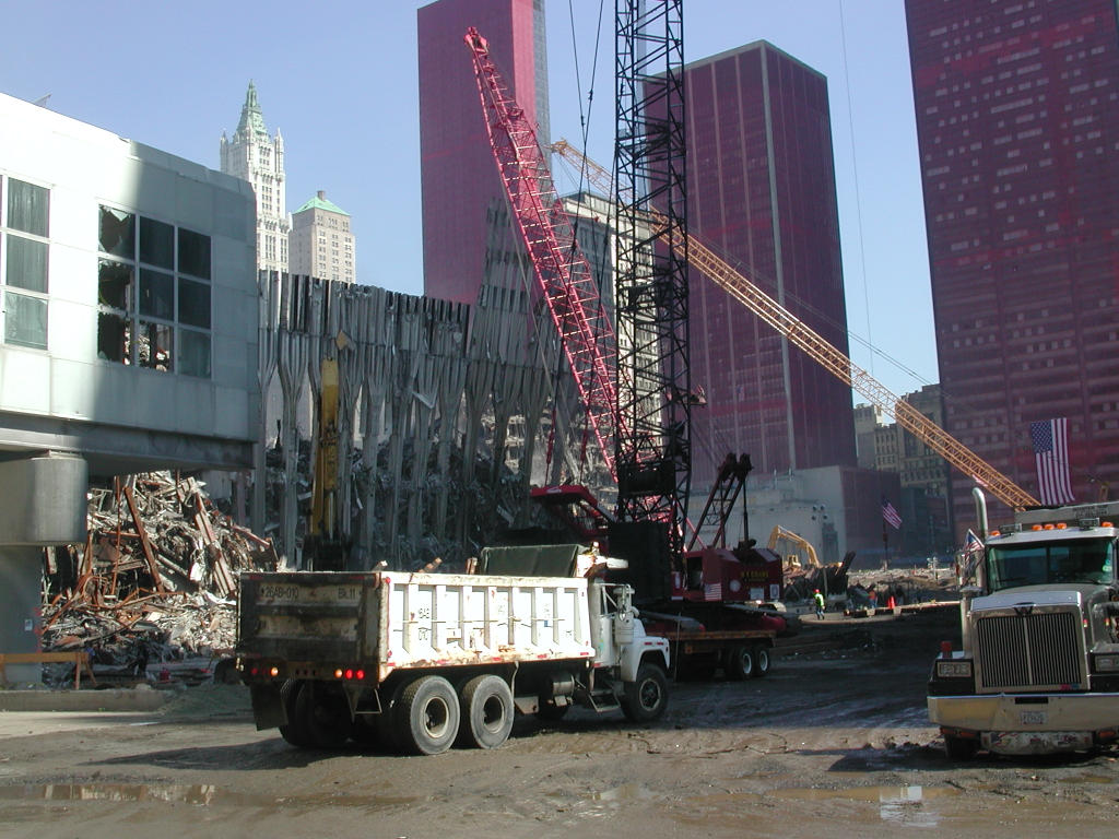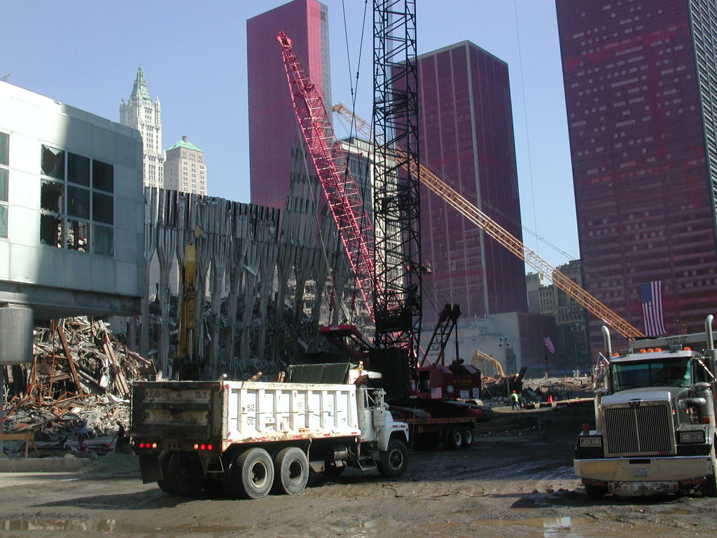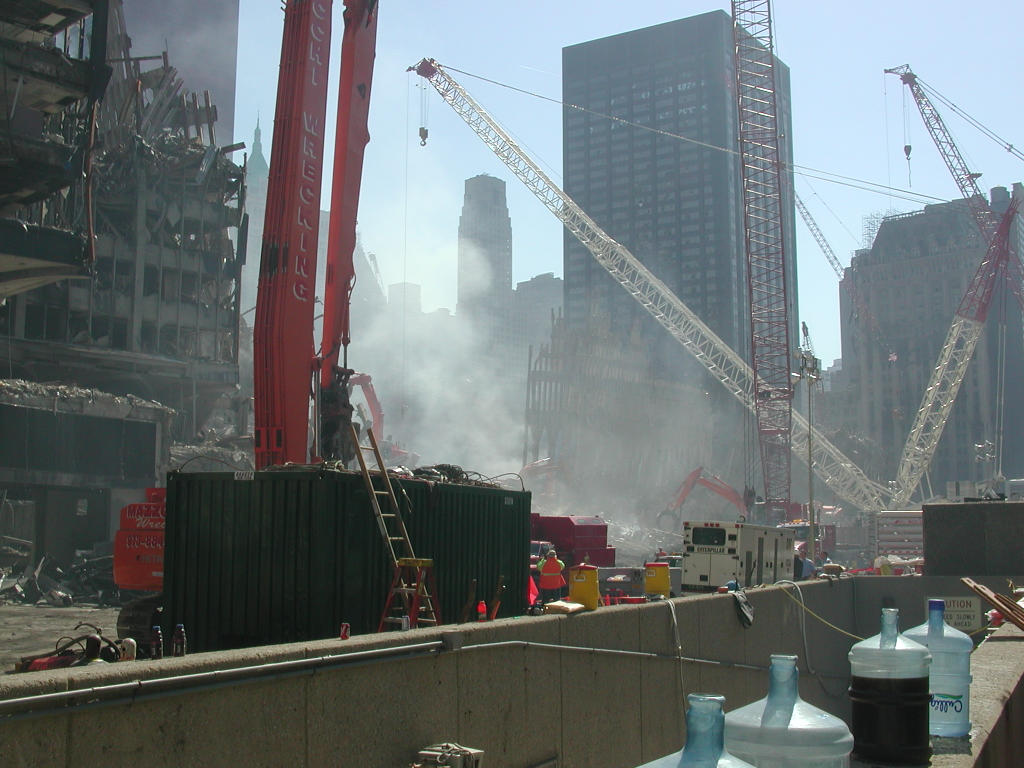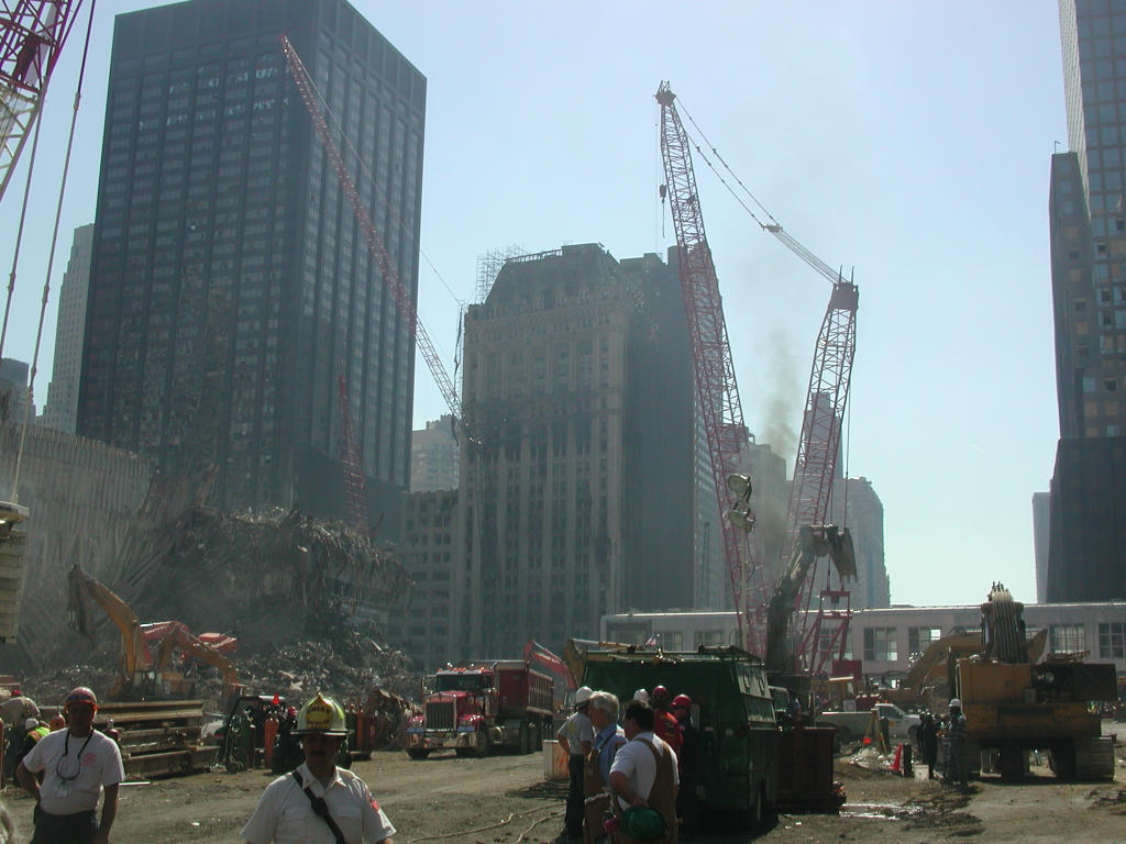 These 72 photographs of the World Trade Center disaster site in New York City were taken by AP on 3 October 2001, about noon. The first few, 001-004, were taken from Broadway, walking south, several blocks east of the WTC site from street corners where a part of the site can be seen. These locations are where the public is blocked by barricades and guards.
