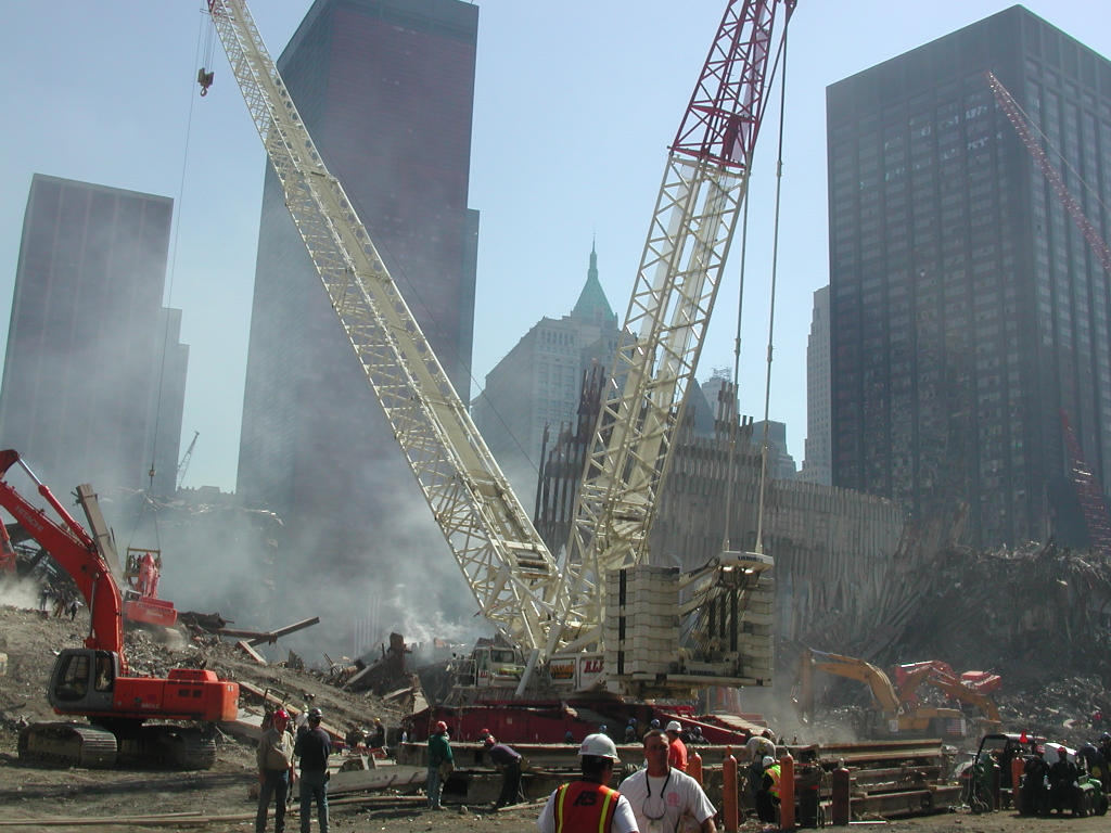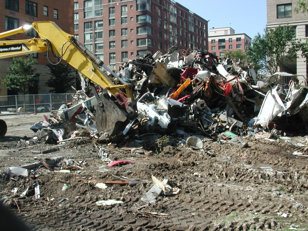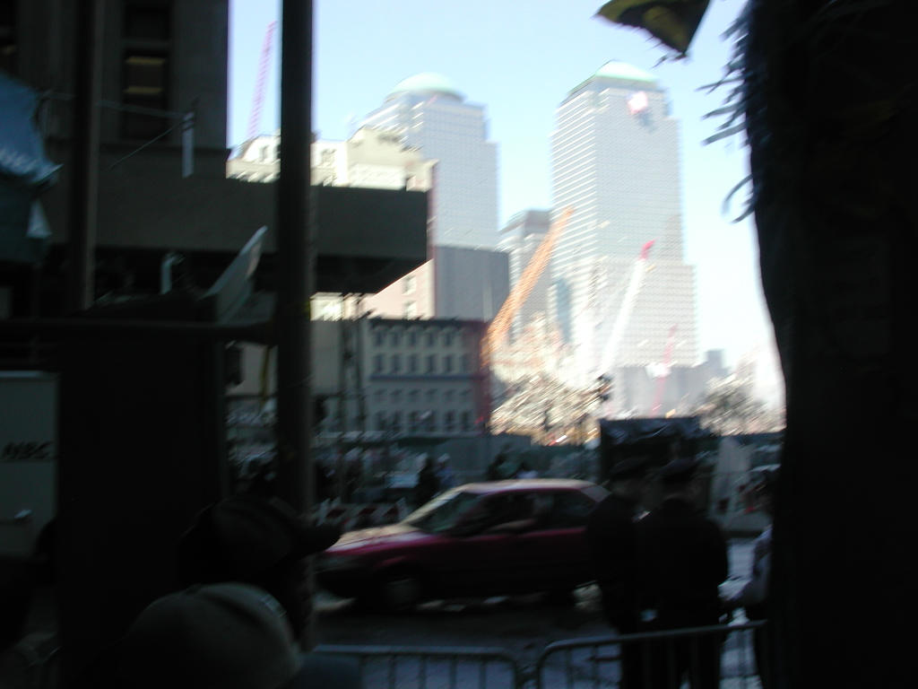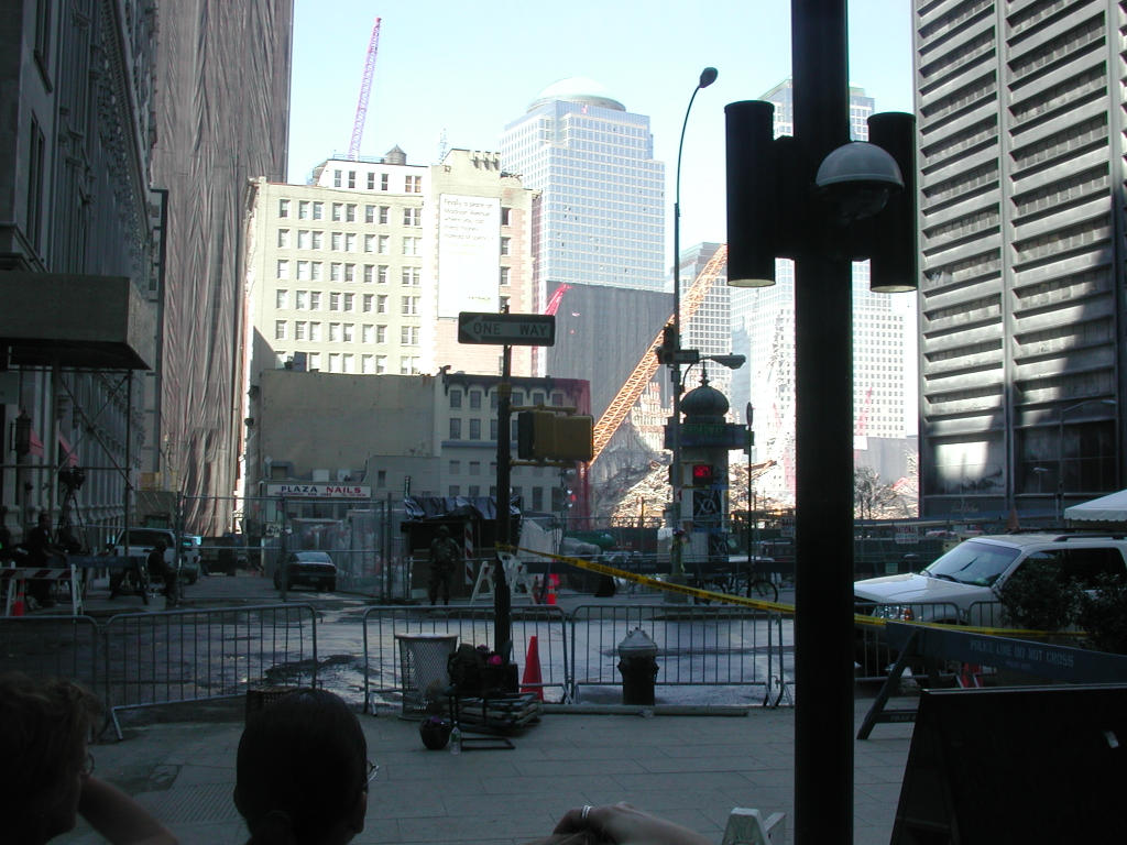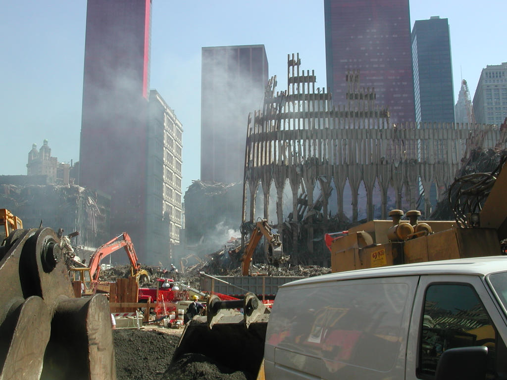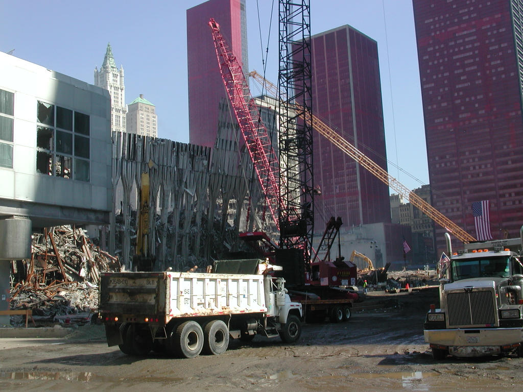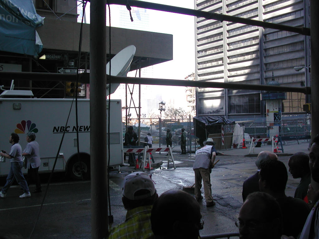 These 72 photographs of the World Trade Center disaster site in New York City were taken by AP on 3 October 2001, about noon. The first few, 001-004, were taken from Broadway, walking south, several blocks east of the WTC site from street corners where a part of the site can be seen. These locations are where the public is blocked by barricades and guards.