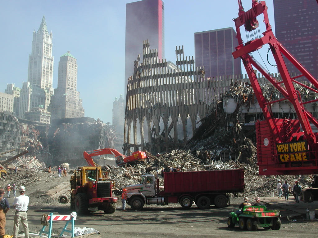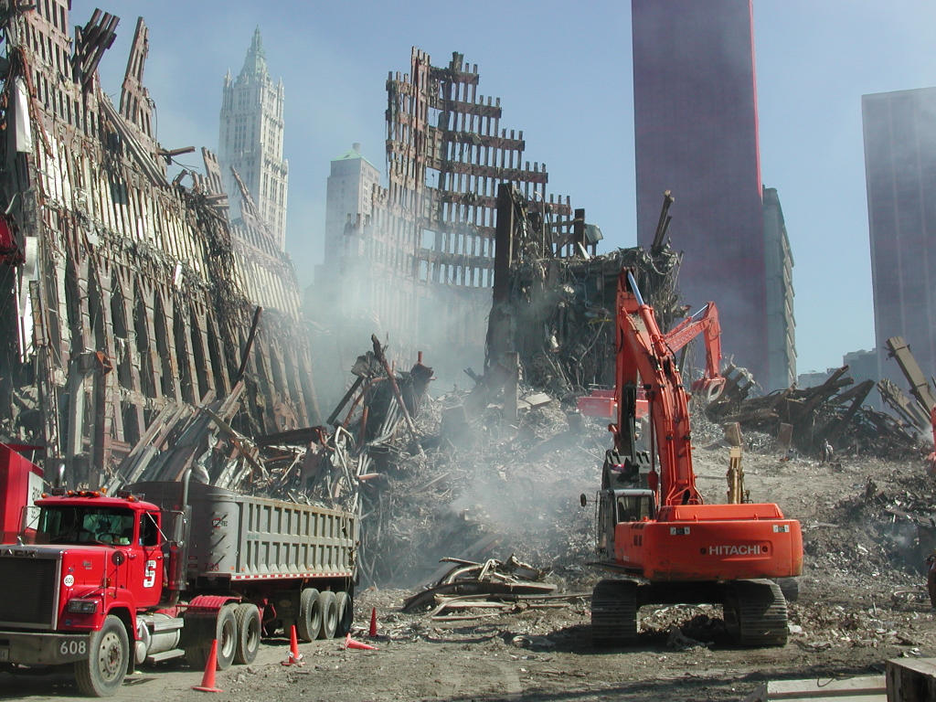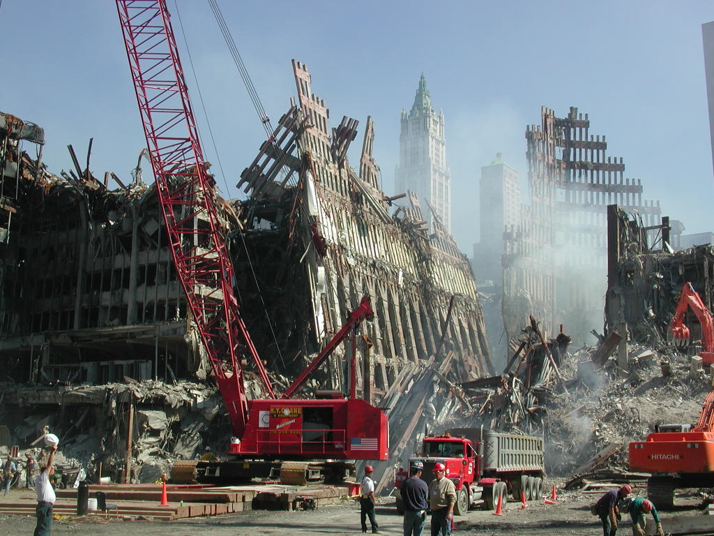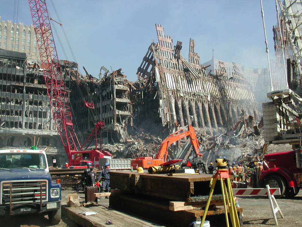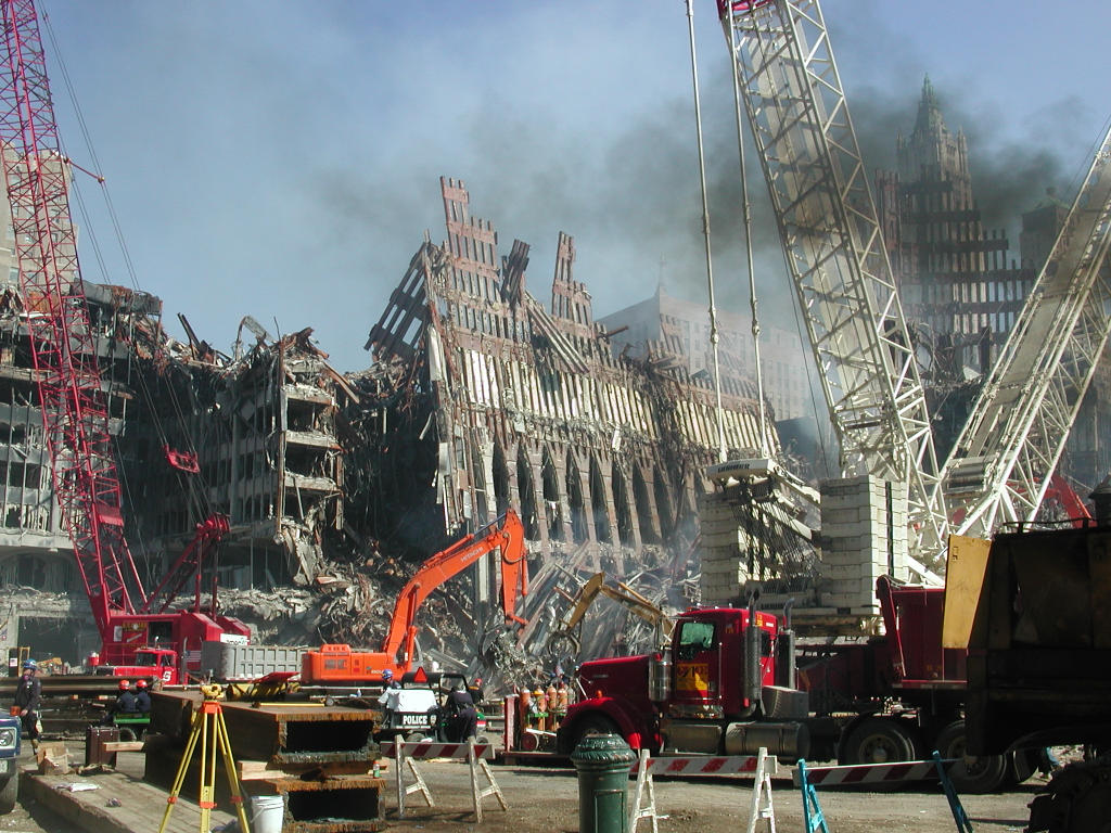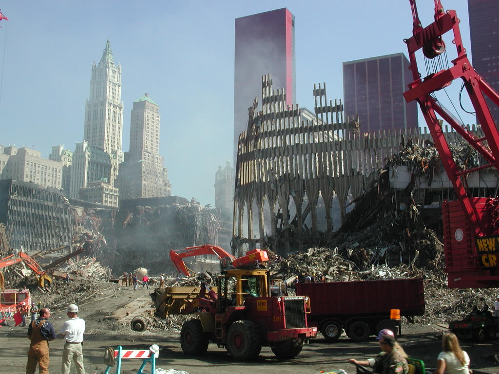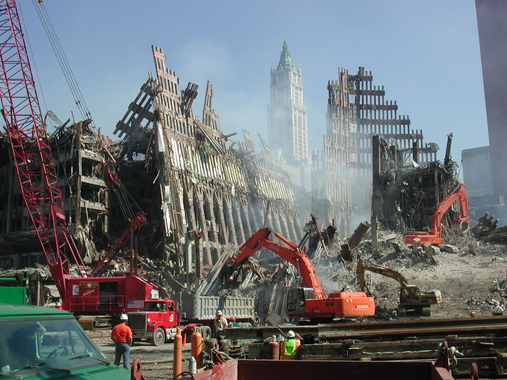 These 72 photographs of the World Trade Center disaster site in New York City were taken by AP on 3 October 2001, about noon. The first few, 001-004, were taken from Broadway, walking south, several blocks east of the WTC site from street corners where a part of the site can be seen. These locations are where the public is blocked by barricades and guards.