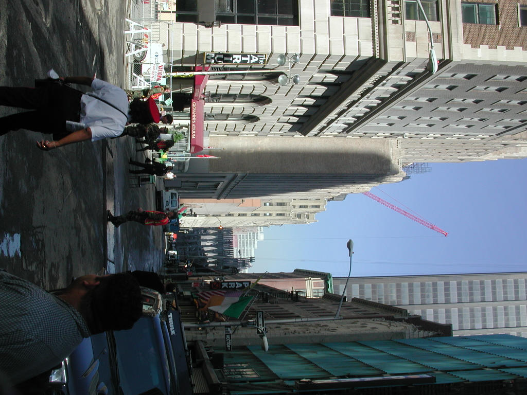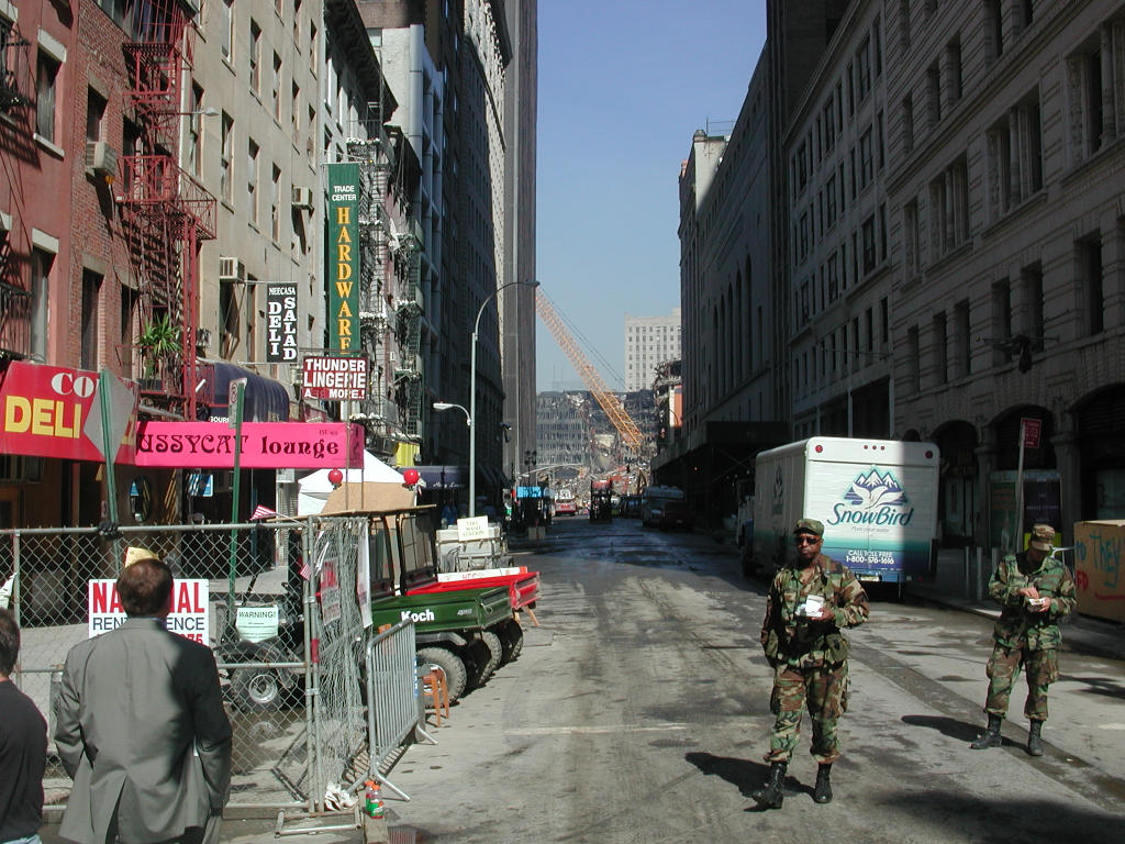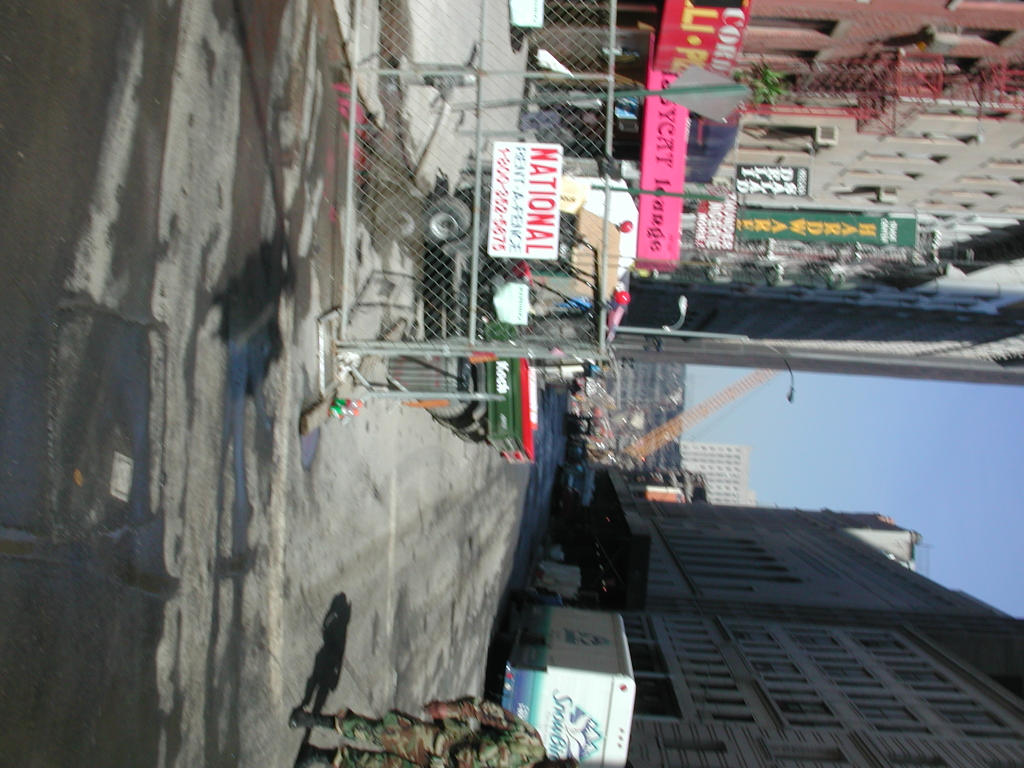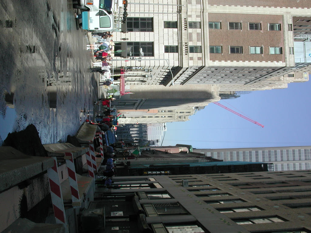 This street intersected the West Side Highway, a wide boulevard which passes by the WTC site. A series of photos, 013-018 were taken walking north toward the site. There were no barricades or guards along this path, which was surprising for the site is carefully guarded at most of its perimeter by police and the military and the public is kept at least two blocks distant and usually much farther away.