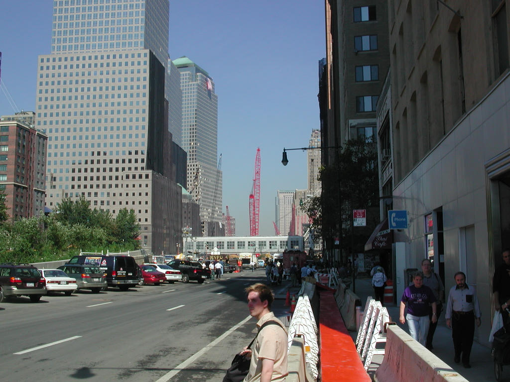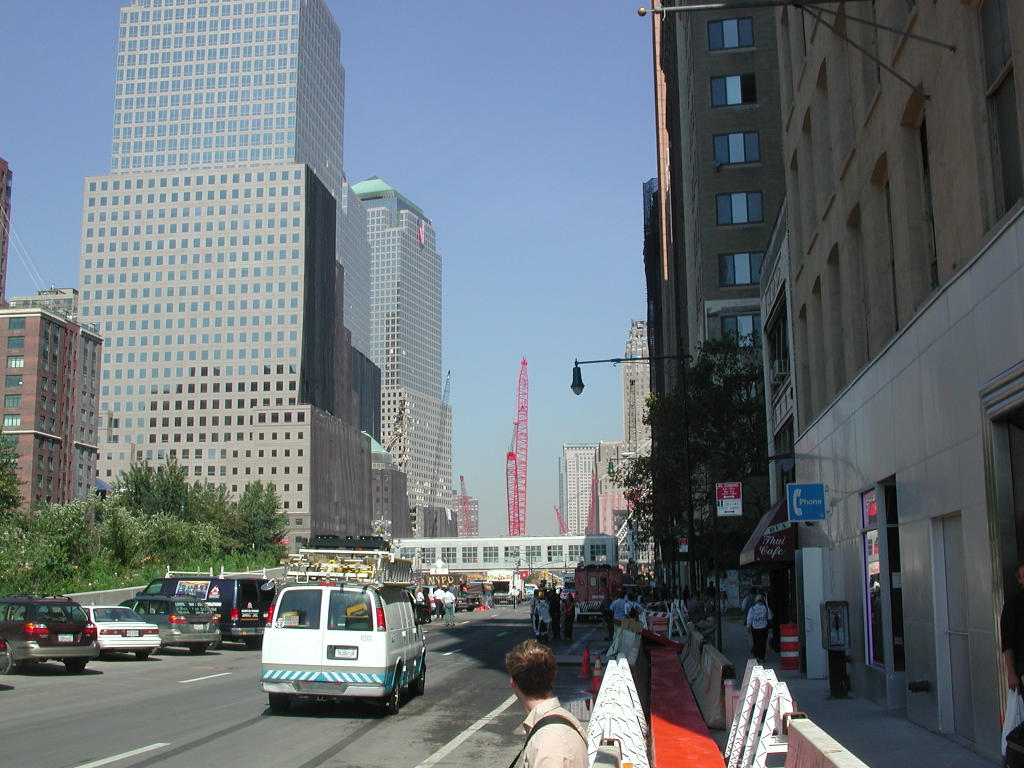 From the West Side Highway walking north, looking east to the WTC and west to the World Financial Center (WFC):