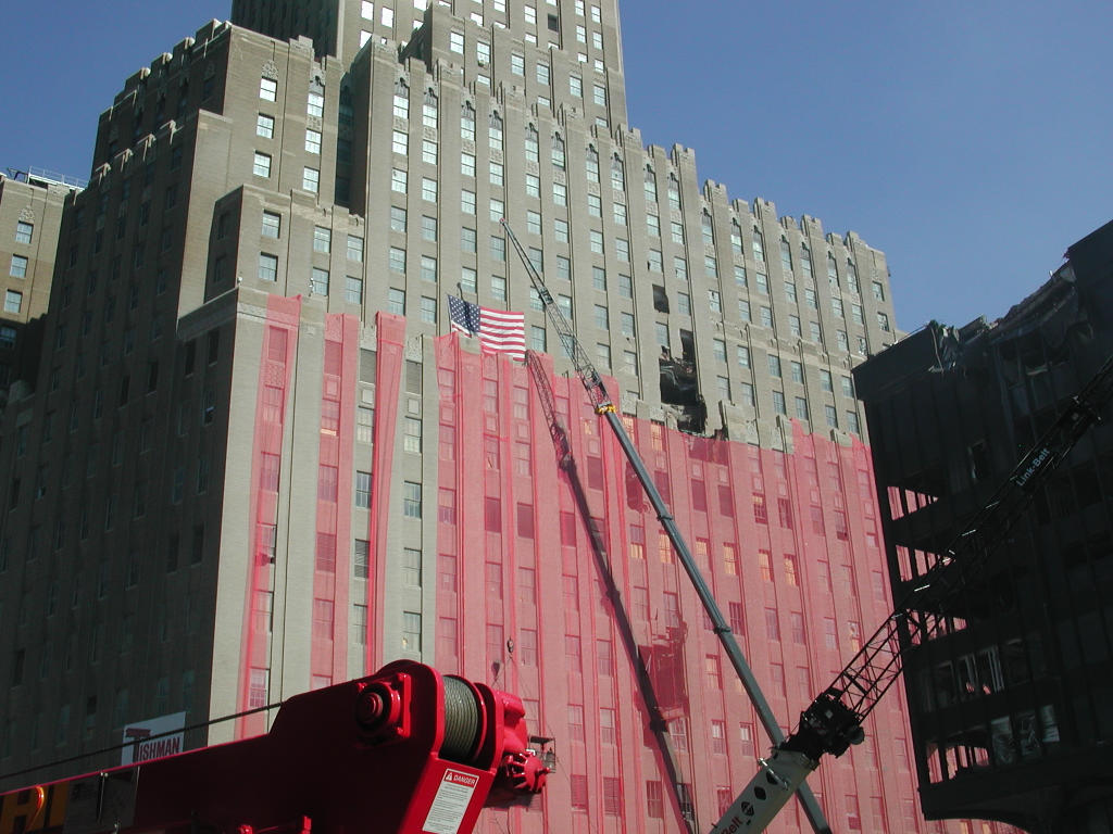 Crimson screened building beyond is the damaged Millennium Hotel.