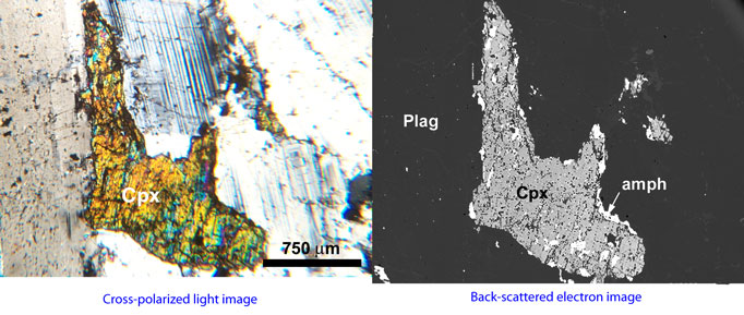 The aim of qualitative analysis is to quickly identify the sample without resorting to detailed calibration and concentration measurement involced in quantitative analysis. The Energy Dispersive Spectrometer (EDS) in combination with a back-scattered electron (BSE) detector is ideally suited for this purpose. Electron back-scattering is a function of the average atomic number of the specimen. Hence, a BSE image efficiently distinguishes different phases in the sample (e.g., minerals in a rock) that cannot be distinguised easily in a conventional optical microscope image. For example, amphibole (amph) at the rim of clinopyroxene (cpx) cannot be easily recognized in the cross-polarized light image below: