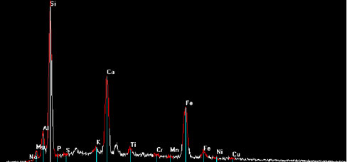 Once phase distinctions based on electron back-scattering properties are made, the elements in each phase can be easily identified by collecting an EDS X-ray spectrum with the beam positioned on the phase. The EDS spectrum below shows a typical hornblende (a common amphibole mineral) spectrum. The clinopyroxene spectrum is similar but it does not show the potassium peak and aluminum is usually lower.