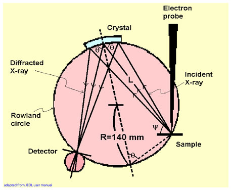 The Wavelength Dispersive Spectrometers (WDS) are used to obtain concentration of all elements present in a spot, and X-ray maps showing distribution of elements in a flat cross-section of the sample. The electron beam diameter is 1 micrometer. Therefore, the spot analyzed is a few cubic micrometers in volume, and the maximum resolution of the X-ray maps is 1 micrometer. WDS takes advantage of Bragg's Law of diffraction, which ensures that only the desired X-ray wavelength reaches the detector. The sample, the diffracting crystal and the detector are positioned on a focusing (Rowland) circle that has a fixed radius by design. The angle of diffraction may be changed to detect other X-ray wavelengths by tilting and moving the diffracting crystal toward or away from the sample. The detector moves simultaneously with the crystal such that the radius of the focusing circle remains constant although the circle itself changes position.