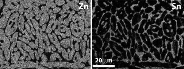 X-ray maps are useful in sets. The number of maps that can be acquired simultaneously depends on the number of WD spectrometers available. There are two methods of acquiring X-ray maps. The first involves a stationary sample as the beam rasters over the desired area. This method is suitable for small area imaging as shown in Zn and Sn images of a Zn-Sn composite below: