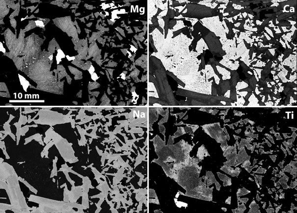 For large areas, however, beam rastering results in defocusing in the peripheral parts of the image. To alleviate defocusing problems, the image is acquired by keeping the beam stationary while the sample stage is moved to expose the surface to be imaged. Four simultaneously acquired maps of a large surface of a rock using this technique are shown below: