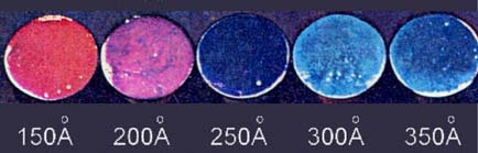 The surface of the sample must be electrically conductive to avoid charging by the electron beam. Therefore, insulating samples are carbon coated in vacuum by passing electric current through high purity graphite rods (electrodes). Carbon evaporates at the point of contact of the two electrodes and deposits on the surface of the sample. A polished brass surface is used to monitor the coating thickness. A thickness of ~250 Angstrom that corresponds with a deep blue color on brass (see below) is recommended.