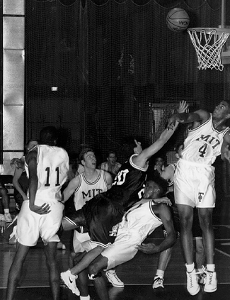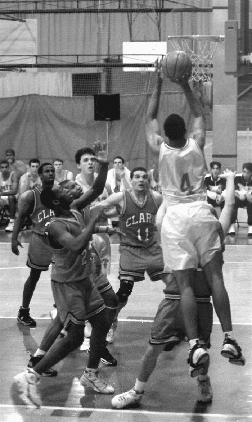 Kareem Benjamin '97 elevates over a player from Clark University. The MIT Engineers won this home game 85-81. |