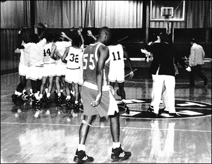 Not only was Godfrey Innis '98 known for his excellent shot blocking ability, here he proves that he can also take the charge. |
