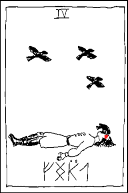 Four of Ravens: (The End augmented) A man lies is the street,