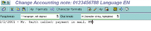 - Maintain Accounting Notes Accounting notes (for example, highlights/outcome of a phone conversation) can be added by client departments and A/R personnel. They are maintained as part of the customer master record and can be printed on aging reports.