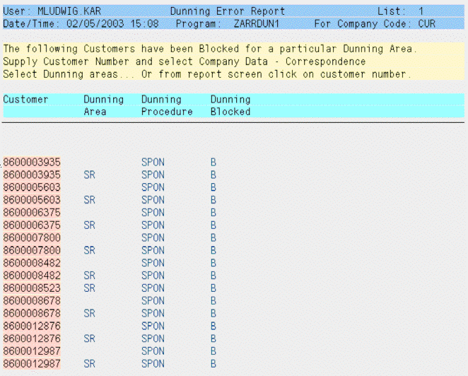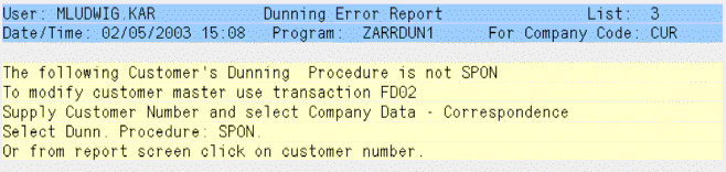 For example, shown below is the report page telling how to correct customers records with Dunning Procedure not equal to SPON.