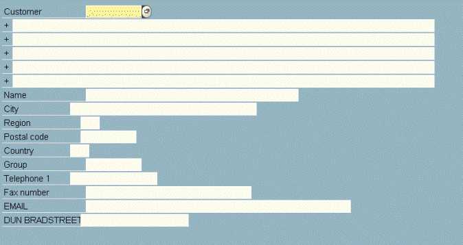 To add a new customer, click on New Entries button at top of "Change" screen. The screen shown in step 4 displays.