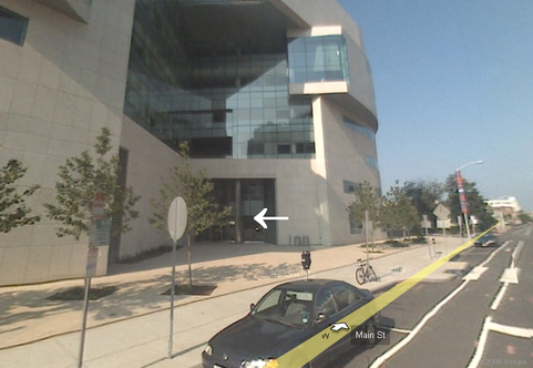 Enter Building 46 from the Main St. entrance (as indicated by the white