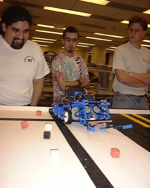 Team 4 in lab before the qualifying round. Although this shows an earlier version of our design, you can still see that a block is being sucked up in the photo. This was the only picture of our robot available when this page was composed, but for pictures of the final robot design, and closeups of specific functional parts, check Chris Avrich's Design Report.
