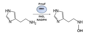 Pseudomonas entomophila is an entomopathogenic bacterium whose complete genome has been elucidated, yet there are gene clusters that are being studied to determine their biosynthetic pathways. One of the proteins in the biosynthesis of pseudomonine, a salicylic acid based siderophore, is PmsF. A siderophore is an important compound that helps iron intake in many soil microorganisms. PmsF protein is a flavin-dependent hydroxylase present in Pseudomonas entomophila and is responsible for the hydroxylation of Histamine in the biosynthesis of pseudomonine. The goal of this project is to find and optimize the conditions for crystallization of PmsF with its cofactor FAD. Crystal and precipitant screens were tested and optimized by varying pH and salt concentration. The first crystals grew in what seemed to be a single crystal with small rods growing from the sides. By the use of additives we were able to get crystals in a more diamond-like shape, but small. These crystallized with 0.1 M sodium acetate, pH 4.6 and 1.5-2.0M sodium formate. The final crystals were collected and used for x-ray crystallography data collection. The PmsF crystals are highly mosaic; and so further optimization must be done to get better quality crystals. When better crystallization conditions are found, PmsF Selenium-Methionine protein will be screened under the same conditions. Once crystallization of both proteins has been optimized and quality diffraction is obtained, the protein structure of PmsF can be solved.