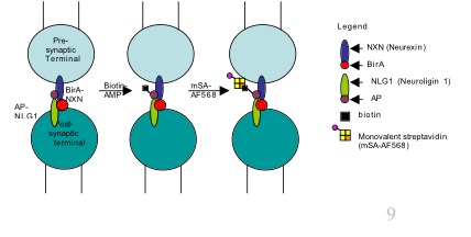 In the nervous system, information is exchanged at neuronal synapses. Neurexin (NXN) and neuroligin (NLG) are proteins found on the surfaces of pre and post-synaptic terminals respectively. The NXN-NLG interaction complex induces the clustering of proteins normally present at excitatory or inhibitory postsynaptic sites, however, when during the course of synaptogenesis, this interaction occurs is unclear primarily, because of lack of a suitable method to image this phenomenon. Current methods to study such protein-protein interactions are limited to colocalization assays using fluorescent protein fusions or antibody staining. However, such methods are constrained by the limit of resolution of optical diffraction (~200nm). Thus when two proteins are deemed to colocalize using optical microscopy methods, all one can say with certainty is that they are within a 200 nm distance of each other. In addition many proteins (such as neurexin) do not tolerate fusion of fluorescent protein tags and the tags often create problems in protein trafficking. The Ting lab has developed an enzymatic labeling based methodology that allows the imaging of NLG1-NXN interactions at excitatory synapses. In this method, the E. coli biotin ligase (BirA) is fused to NLG1 and its substrate the acceptor peptide (AP) is fused to NXN. When NLG and NXN interact at synapses and biotin is added, BirA ligates the biotin onto the AP which is then detected via a strepatavidin-AlexaFluor conjugate. This provides a direct read out of the NXN-NLG interaction at synapses. To develop a complementary system, we wanted to design a BirA-NXN/AP-NLG1 pair (opposite orientation of BirA and AP). For this purpose, I had to create a BirA-NXN fusion construct which would traffick properly to axons. I then demonstrate that the BirA-NXN and AP-NLG1 can also provide a readout of NXN-NLG interaction at the cell surface demonstrating the versatility of this enzymatic labeling method.