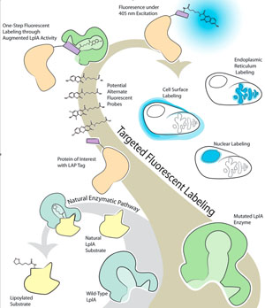 The Lipoic Acid Ligase (LplA) enzyme of Escherichia coli covalently ligates the cofactor lipoic acid to a specific lysine residue on each of its three natural substrates. This substrate specificity and the plasticity of LplA's small molecule binding pocket render LplA a favorable candidate upon which to develop a fluorophore ligation system for targeted protein imaging. It has been shown that E.coli LplA can be mutated to ligate 7-hydroxycoumarin onto both its natural substrate and an evolved 13-mer peptide tag with high specificity.