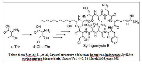 Syringomycin biosynthetic enzyme II (SyrB2), a key protein involved in syringomycin biosynthesis, is a non-heme iron enzyme that is responsible for converting L-Thr to 4-Cl-Thr. This chlorination reaction is an essential step in the synthesis of this antifungal agent. The goal of this work is to create SyrB2 mutants which can be biochemically and structurally characterized using x-ray crystallography as a primary tool. Specifically, this work aims to investigate the halogen specificity and reactivity of the enzyme. We used site-directed mutagenesis to alter the primary and secondary sphere of the Fe(II) cofactor in the enzyme's active site, most importantly around the halogen binding site near residue A118. The differing active site environments may allow other halogenation reactions, such as di- or tri-chlorination. While the basis for performing multiple halogenations over single halogenations has not yet been elucidated, these mutations, based on the sequence of barbamide biosynthesis enzymes I and II (which can trichlorinate leucine), may allow SyrB2 to catalyze multiple chlorination reactions on a single substrate, providing clues as to how the reactivity is controlled. Also, by enlarging the binding pocket, we hope to allow iodine binding in the active site, which has not yet been seen. If iodine can bind in the pocket, it should allow the iodination reaction, an unknown reaction for this class of enzymes. Overall, by mutating the primary enzyme sequence, we aim to create new enzymes that will not only tell us about how nature controls its use of halogens but can also aid in the production of biosynthetic natural products. This research has the potential to enable custom-designed compounds which can be medicinally useful.
