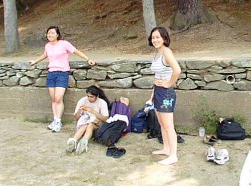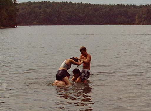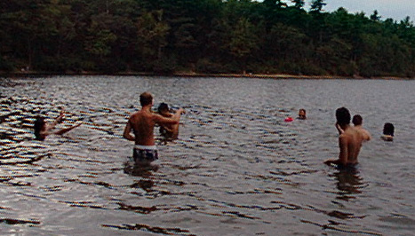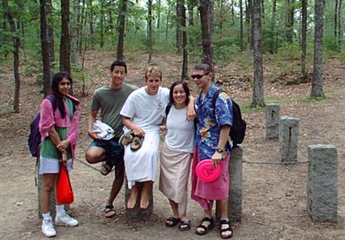Jen, Juhi, and Stephanie on the beach Juhi, Steve, Tim, Stephanie, and Brad in front of Thoreau's cabin site Steve and Tim playing frisbee Steve, Brad, Stephanie, and Tim playing frisbee Brad, Stephanie, Tim, and Steve chicken-fighting Brad, Juhi, Stephanie, Tim, Steve, David, and Eli in the water Everyone playing keep-away