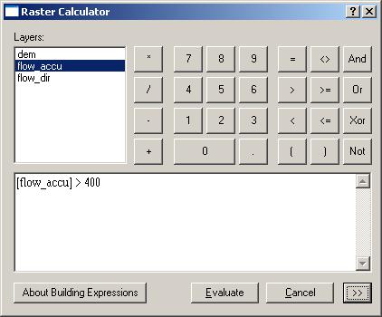 Create the drainage grid. This should contain only the cells that have 400 or more cells contributing runoff them. To do this, go to the Spatial Analyst menu, click on Raster Calculator and make the selection [flow_accu] > 400