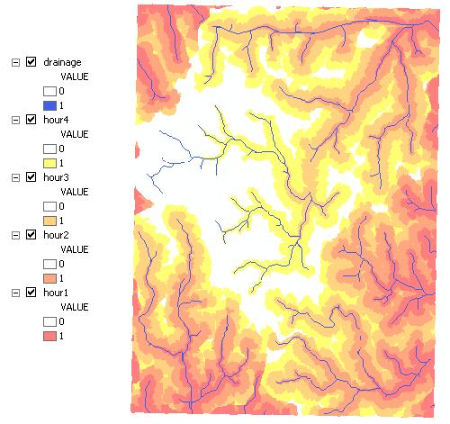 Continue for the first 4 hours of flow. Rename each "hour1", "hour2", etc... Make the area not represented by the hour (value=0) "no color", so that only the area that drains within each hour shows.
