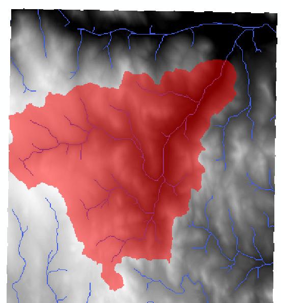 For this work, you can use the DEM that you downloaded and used in previous assignments. Pick a large basin in the DEM using the stream network and contour lines or DEM shading. Using the watershed tool on the Hydrology menu, create a grid that represents the basin. Make sure the basin is completely within or at least nearly completely within your DEM data (in the example below, it overlaps the edges just a little bit, which is OK).