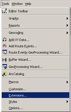 ArcGIS's raster manipulation tools are bundled with its Spatial Analyst extension. It's a big bundle so lets open ArcGIS's help system first to find out more about the tools. Open the ArcGIS help page by clicking Help > ArcGIS Desktop help from the menu bar. Click the index tab and type "Spatial analyst'. During the exercise, you'll find these online help pages helpful in clarifying the choices and reasoning behind a number of the steps that we will explore. Be sure, at some point, to take a look at the Overview section. (You can also open ArcGIS Help directly from the Windows operating system via: Start / Programs / ArcGIS / ArcGIS-Desktop-Help.)The Spatial Analyst module is an extension, so it must be loaded into ArcGIS separately.