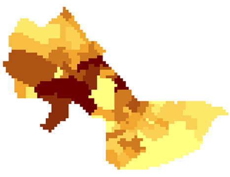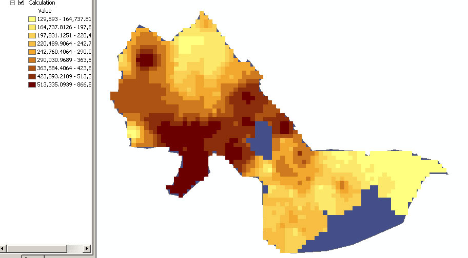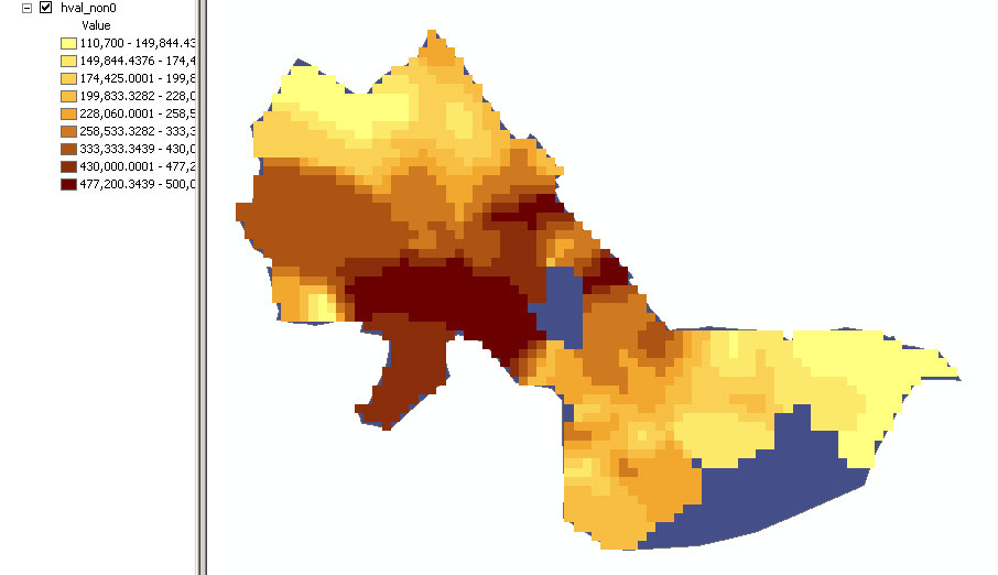 Many other variations on these interpolations are possible. For example, we know that med_hvalue is zero for several block groups--presumably those around Harvard Square and MIT where campus and commercial/industrial activities results in no households residing in the block group. Perhaps we should exclude these cells from our interpolations--not only to keep the 'zero' value cells from being displayed, but also to keep them from being included in the neighborhood statistics averages. Copy and paste the cambbgrp.shp layer into the same Data Frame and use the query tools in the Layer Properties > Definition Query tab to exclude all block groups with med_hvalue = 0 (which means include all block groups with med_hvalue > 0). Now, recompute the polygon-based interpolation (including the neighborhood averaging) and call this grid layer 'hvalue_non0'. Select the same color scheme as before. In the data window, turn off all layers except the original camborder layer (displayed in a non-grayscale color like blue) and the new hvalue_non0 layer that you just computed. The resulting view window should look something like this: