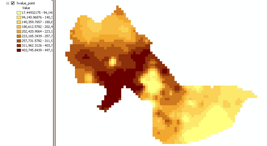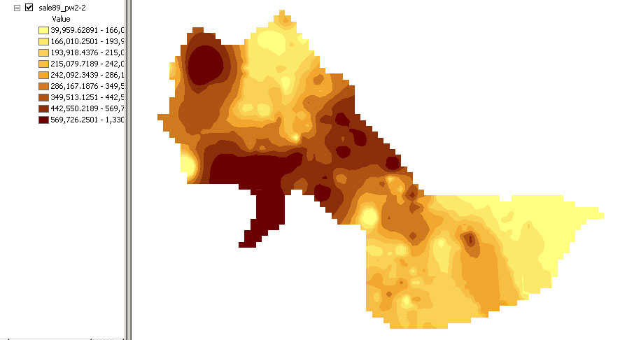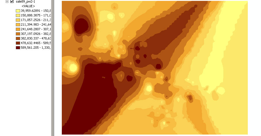 Note: None of these interpolation methods is 'correct'. Each is plausible based on a heuristic algorithm that estimates the housing value at any particular point to be one or another function of 'nearby' sales prices. The general method of interpolating unobserved values based on location is called 'kriging' and the field of spatial statistics studies how best to do the interpolation (depending upon explicit underlying models of spatial variation). Recent versions of ArcGIS offer an optional 'GeoStatistical Analyst' extension that includes several tools for kriging and exploratory spatial data analysis. (Check out the ArcGIS help files.) For further discussion of kriging methods and spatial statistics, you may also be interested in S+ Spatial Stats: User's Manual for Windows and Unix, by Kaluzny, Bega, Cardoso, and Shelly, MathSoft, Inc., 1998 (ISBN: 0-387-98226-4). 'Spatial Statistics' is an add-on to a high-powered statistical package called S+ that is available on Athena.