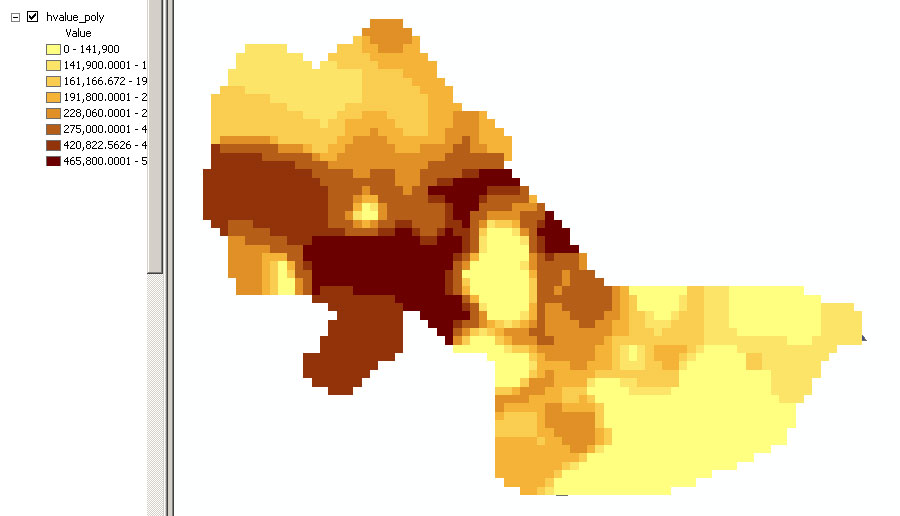 The block group census data and the sales data contain relevant information about housing values, but the block group data may be too coarse and the sales data may be too sparse. One way to generate a smoother housing value surface is to interpolate the housing value at any particular location based on some combination of values observed for proximate housing sales or block groups. To experiment with such methods, we will use a so-called 'raster' data model and some of the ArcGIS Spatial Analyst's capabilities.