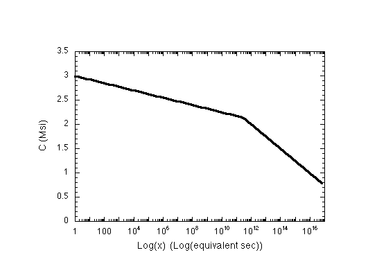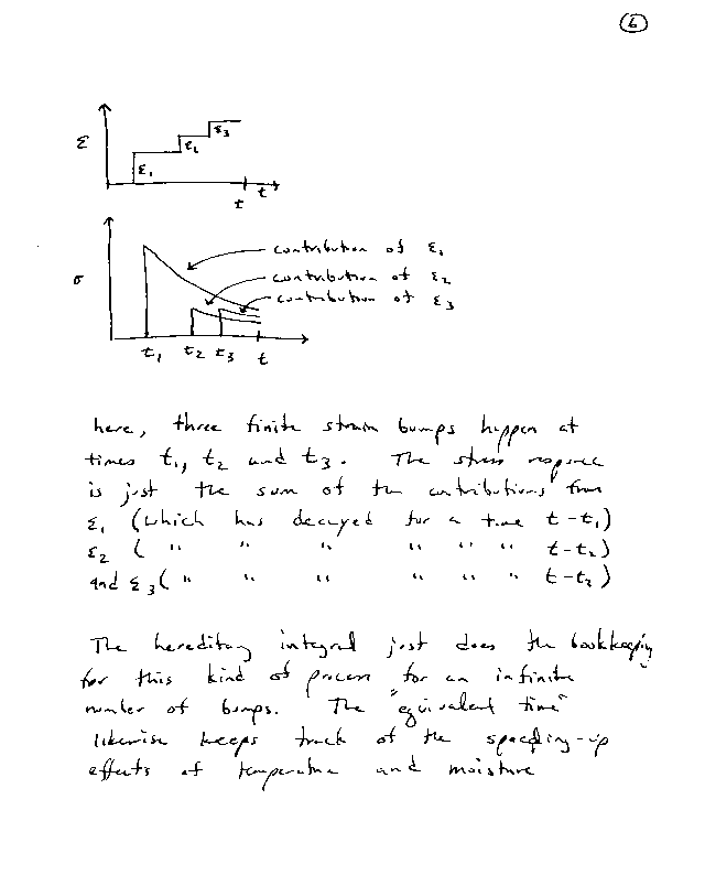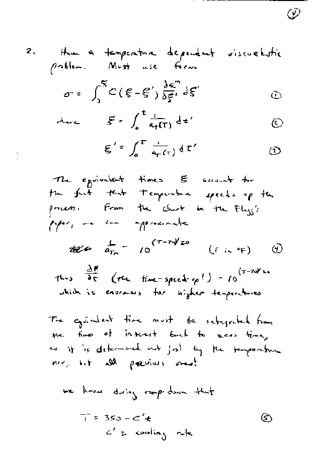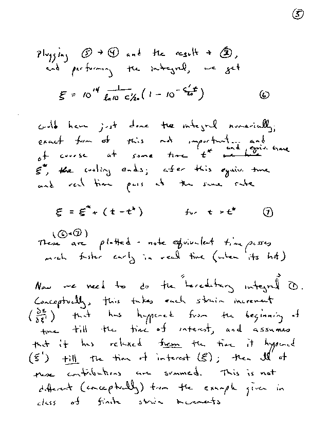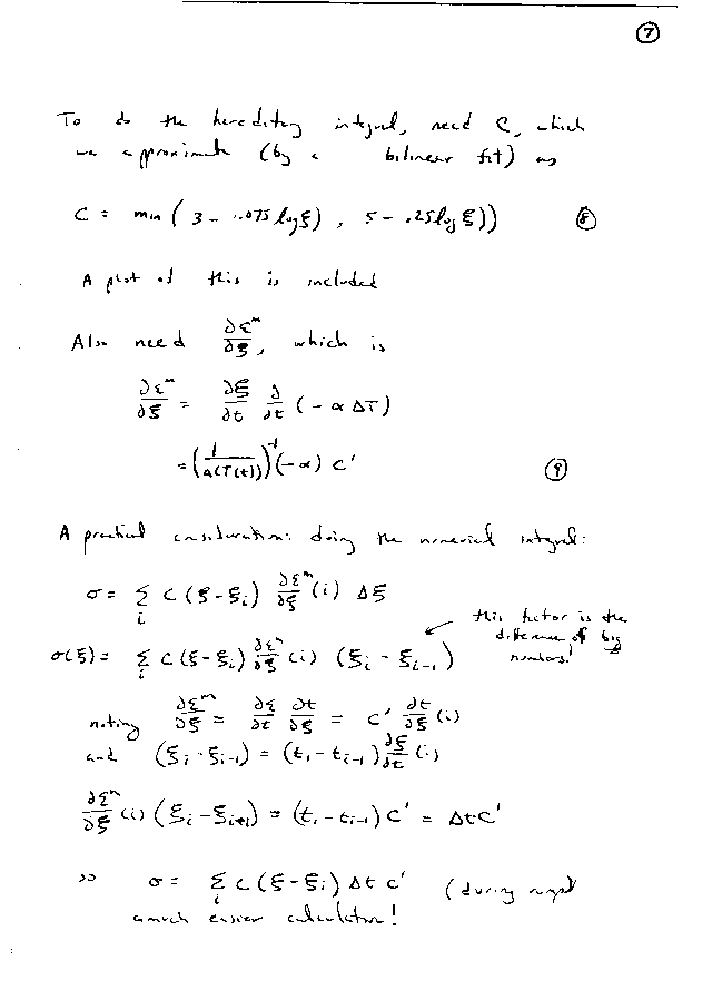 character*1 tab double precision time(1000), Temp(1000), x(1000), xx(1000), +oneoverat(1000), dedx(1000), C(1000), stress(1000) c set cprime (in F/sec), other fixed stuff tab = char(09) cprime = 10./60. alpha = 1.3 dt = 280/cprime/800 deps = - dt * cprime*alpha c set times to check. Lots of steps on the ramp c plus a bunch after its over. c Also, do T and x (squiggle), from the curve fits c and integral calcs in the written solution, c and compute time-speed-up and strain increments time(1) = 0. temp(1) = 350 x(1) = 0 C(1) = 3. oneoverat(1) = 10.**14 dedx(1) = -cprime*alpha/oneoverat(1) c during ramp (800 steps!) F_DoBackground call just makes this act c like a proper Mac application do 1 i = 1, 800 write (6,801) i CALL F_DoBackground time(i+1) = dt * i Temp(i+1) = 350-cprime*time(i+1) x(i+1) = 1.e+14/(log(10.)*cprime/20)*(1-10**(-cprime*time(i+1)/20.)) oneoverat(i+1) = 10**((Temp(i-1)-70)/20) 1 dedx(i) = -cprime*alpha/oneoverat(i+1) c after ramp (200 steps, one/day) do 2 i = 802,1000 write (6,801) i CALL F_DoBackground time(i) = time(801) + (i-801) * 3600*24 Temp(i) = 70 x(i) = x(801) + time(i) - time(801) oneoverat(i) = 1 2 dedx(1) = 0 c now compute a table of C vs x values. This is just for plotting. xx(1) = 0 C(1) = 3 do 3 i = 2, 1000 xx(i) = 10**((i-1)/1000.*17.) 3 C(i) = GETC(xx(i)) c do hereditary integral stress(1) = 0 c calculate stress at each time i do 200 i = 2,1000 write (6,802) i CALL F_DoBackground stress(i) = 0 c do so by summing over all the strain increments at times c j that go from zero to now (time i); each multipled by c the C value for the time from the strain (j) to now (i) c also note here an avoid to numerical problems- the factor c x(j+1)-x(j) is the difference between two huge numbers, and will c go incorrectly to -> 0 for large times. We note for constant c time steps that the the strain step is also constant, and just c use it (see notes). After ramp (j>800) no deps, so no additional c stess, but note that we still do these calcs even for i>800 c because the x(i)-x(j) terms continue to change c the 'old' way is commented out below- do 100 j = 1, min((i-1),800) stress(i) = stress(i) + deps * GETC(x(i)-x(j)) 100 continue c do 100 j = 1, i-1 c 100 stress(i) = stress(i) + (x(j+1)-x(j)) * dedx(j) * GETC(x(i)-x(j)) 200 continue c big dump of everything in a tab-separated set of columns c only do one out of every 10! do 300 i = 1, 1000, 10 300 write (6,800) time(i), tab, x(i), tab, Temp(i), tab, oneoverat(i), + tab, dedx(i), tab, stress(i), tab, xx(i), tab, C(i) 800 format(1x, 1pd11.3, 7(a1, 1pd11.3)) 801 format ('+ set up ',i3) 802 format ('+ stress calcs ',i3) c that's all folks! stop end C DOUBLE PRECISION FUNCTION GETC(X) DOUBLE PRECISION X C getc = min((3.-.075*log10(x)),(5.-.25*log10(x))) RETURN END C