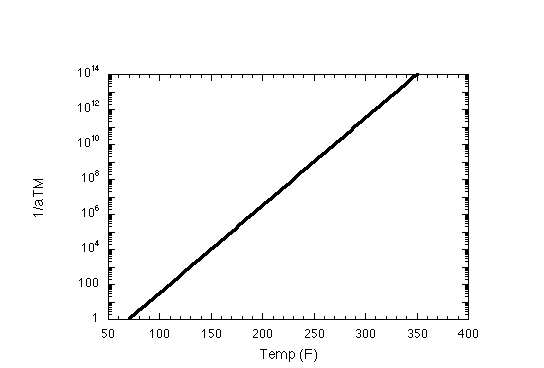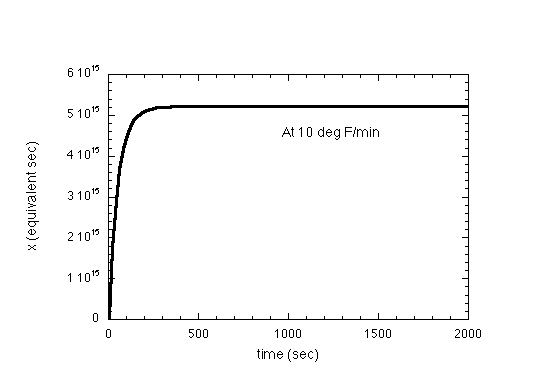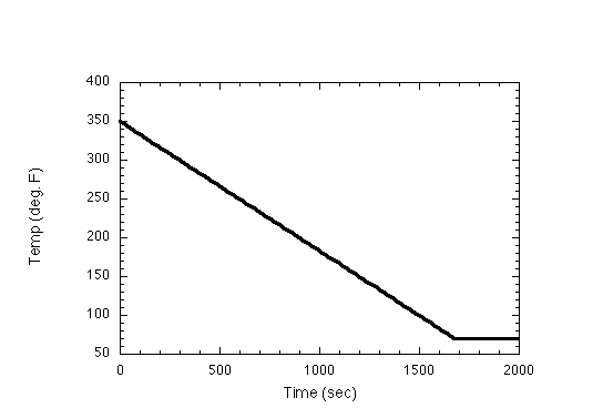 The following are example plots of the temperature as a function of time (at 10 deg.F/min), the factor aTM as a function of temperature (a linear fit to the plot in the paper), the relaxation modulus as a function of equivalent time elapsed (a bi-linear fit to the plot in the paper), and the equivalent time as a function of time (again, for a 10 deg F/min cooldown)