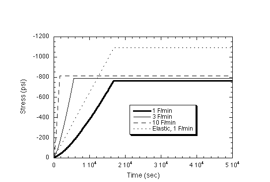 At last, results. Also included elastic responce at 1 F/min for comparison. See that viscoelastic effects are significant, but not very sensative to the ramp rate.