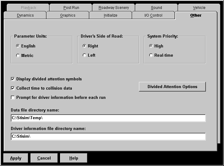 The 2 fields at the bottom of the Other tab box allow you to specify the default folders where STISIM Drive will store the output data file and the driver information database. The first text field ("Data file directory name") specifies where all of the STISIM Drive data files will be stored. The data file directory name should include both a drive designation and a path. If this is left blank, then STISIM Drive will place the data file in the STISIM Drive temporary directory (usually C:\STISIM\Temp). Basically this option lets you save your data files to the destination of your choice. This is handy if you are performing multiple studies because a different configuration file can be setup for each one and the data that is collected can be saved to an entirely different location for each study. The second text field ("Driver information file directory name") allows you to do the same thing except in this case it deals with the driver information database. Before each simulation run you can specify driver information. Some of this information is stored in a file named "Drivers.Data" and can be used from one run to the next. If you are conducting multiple studies you may wish to keep a separate database for each one and keeping various copies of the Driver.Dat file in different directories does this. Use the "Driver information file directory name" to specify where the desired Drivers.Dat file is located.