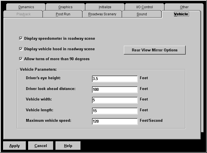 Because this is a driving simulation, the simulator must try and present a realistic vehicle and therefore you must set some parameters that describe the vehicle the that is being driven. These parameters include the vehicle dynamics as well as some characteristics for the vehicle itself. The dynamics are set in the Dynamics tab box whereas the Vehicle tab box allows you to specify physical characteristics of the vehicle. When the vehicle tab is chosen, a tab box similar to the following will be displayed: