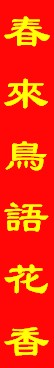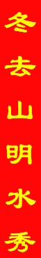 The top chuanlin says "Whole earth return spring." The left chuanlin says "Sping comes bird sing flower fragrant." The third chuanlin says "Winter gone mountain clear water sparkles."