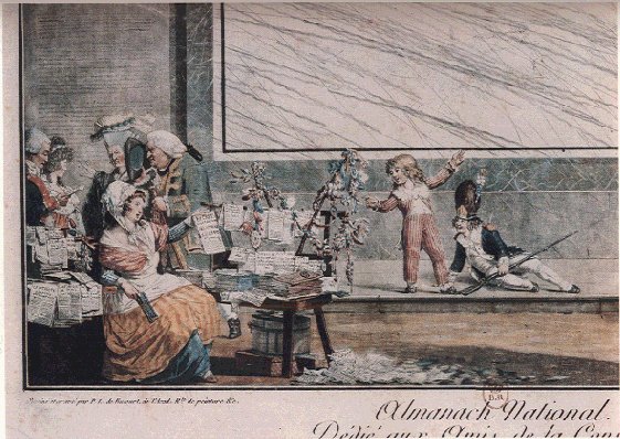 "A Newspaper Vendor." 1791. Color engraving by Philibert-Louis Debucourt. Bibliothèque Nationale, Cabinet des Estampes.
