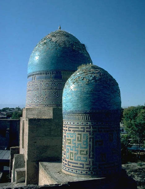 Two of the azure colored tiled domes with their high drums decrated with monumental Kufic patterns.