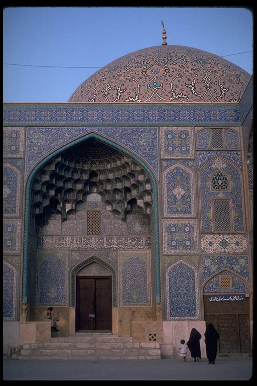The richly tiled portal of the Mosque topped with the off-axis golden tiled dome.