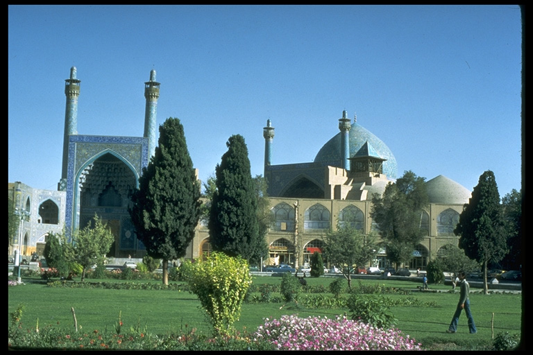 General view of the Mosque from the Maydan-i-Shah showing the portal with its two minarets echoed by the prayer hall iwan with its two minarets and dome.