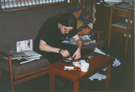 Phil assembles a toy badger. The white and black fur pieces must be cut with precision. Behind him you can see many cans of Stella Artois.