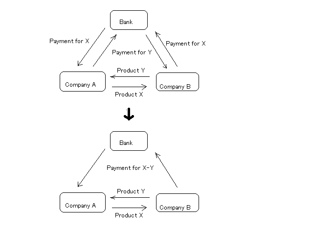 Due to the development of the electronic payment systems, the transaction mentioned above can be changed to the style shown in figure 2. In this style, the transaction between companies and banks occurs only for the payments for the difference between sales of product X and that of product Y. If sales of products X is larger than that of product Y, the transaction caused by these trades is only that company B makes the payment of the difference to company A via the bank. This process is called "netting", which means to compress the amount of settlement via banks by offsetting the debit and the credit among companies.
