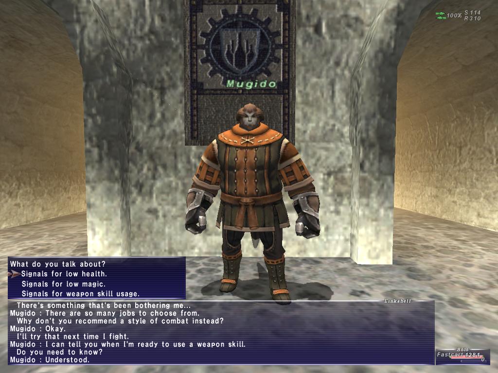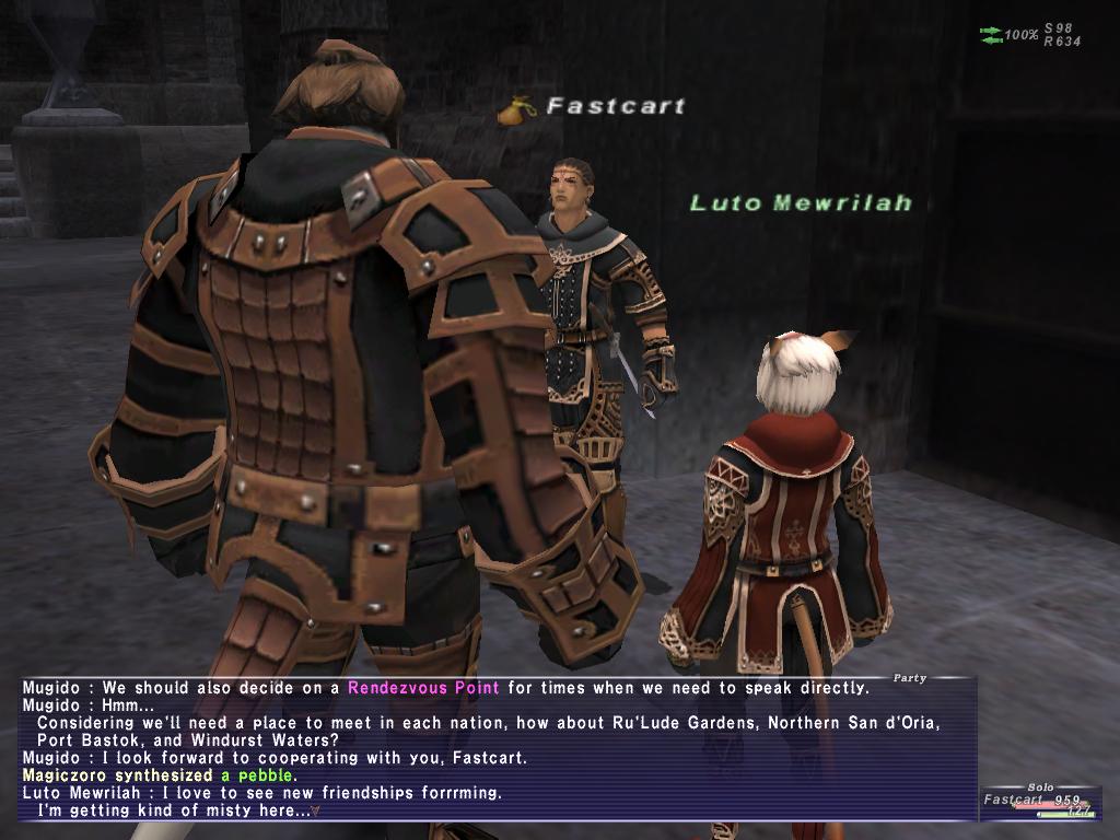 July 20th, 2005 - Here's Mugido telling me how I can speak to him without signaling for him from my Signal Pearl. The Rendezvous Points are at (G-10) in Ru'Lude Gardens (between MH and AH), and just outside the MH of Northern San d'Oria (L-10), Port Bastok (J-12), and Windurst Waters (K-10).