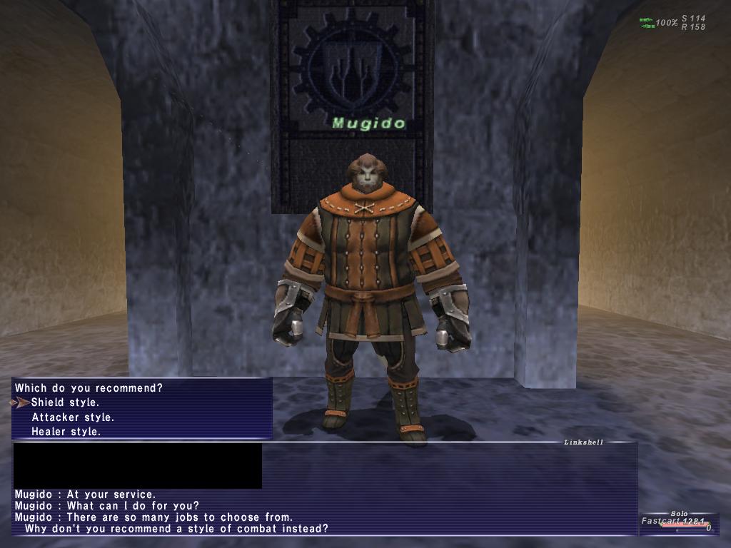 I have a secret... I actually stood in both lines 3 times. I was trying to get a specific look for Mugido. The first time, it was right after I finished updating (after a bit of waiting to log in). I got the 6B Galka (bald Galka with a beard and black hair). Second time, I was much closer to what I wanted, but I got 3A (he had white hair). But because I got 3A, I knew exactly what to do to get the one I wanted. Although, it did cost me six hours of my life because there were 80 people in the Ghelsba Outpost line at this point. So, the third and finally time, I wound up with Mugido as 3B after another two hours (was quick because this was after the emergency maintenance). ^^ It only took me a total of 12 hours.. ;; The two hour discrepancy is from researching the brand-spanking new quest on various forums.