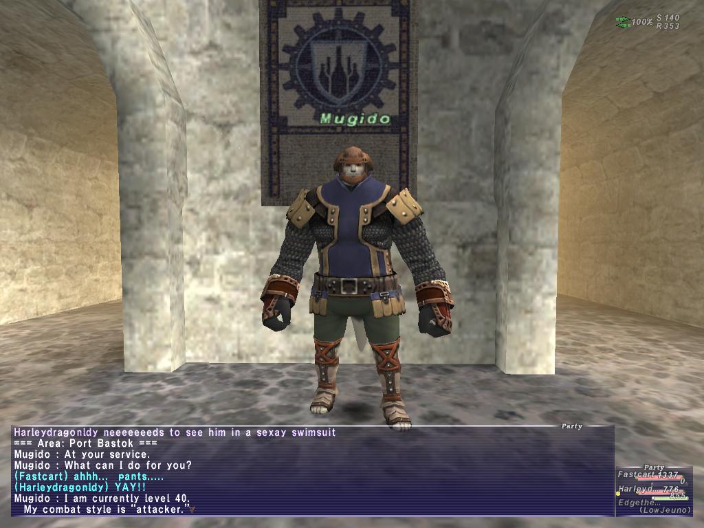 Oh. Please, disregard Harl's emote. She's begging me to get a swimsuit from the current event. But, I told her "Swimsuit + male hume + Bastok = ewwwww" despite her pleas... If I put on that get up, then I'll be in no position to joke about what Mugido is wearing...